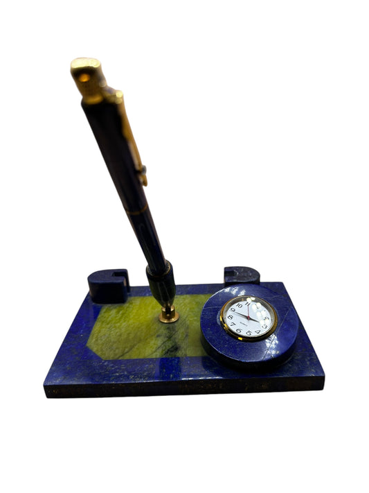 Lapis Lazuli Table Pen and Business Holder with Clock | Unique Serpentine Accent | 6.2” x 4.5” | Elegant Desk Accessory